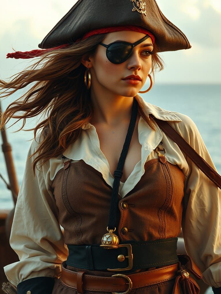 A digital painting of a female pirate captain with sun-kissed skin and scars, dressed in pirate attire. The image features intricate textures and cinematic lighting in a dramatic atmospheric scene.