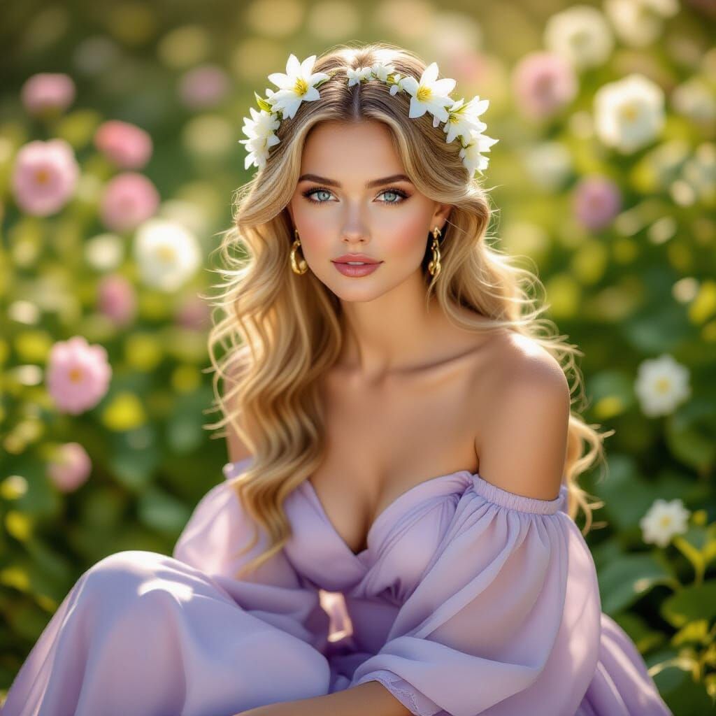 A beautiful woman with honey-blonde hair sits in a floral garden. She wears a pastel gown and lily crown in this image influenced by flowing lines, rich textures and botanical elements.