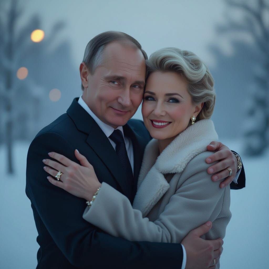 A digital artwork depicts a warm embrace between two figures in elegant attire, set against a cool, misty backdrop with soft volumetric lighting, evoking a serene winter atmosphere.