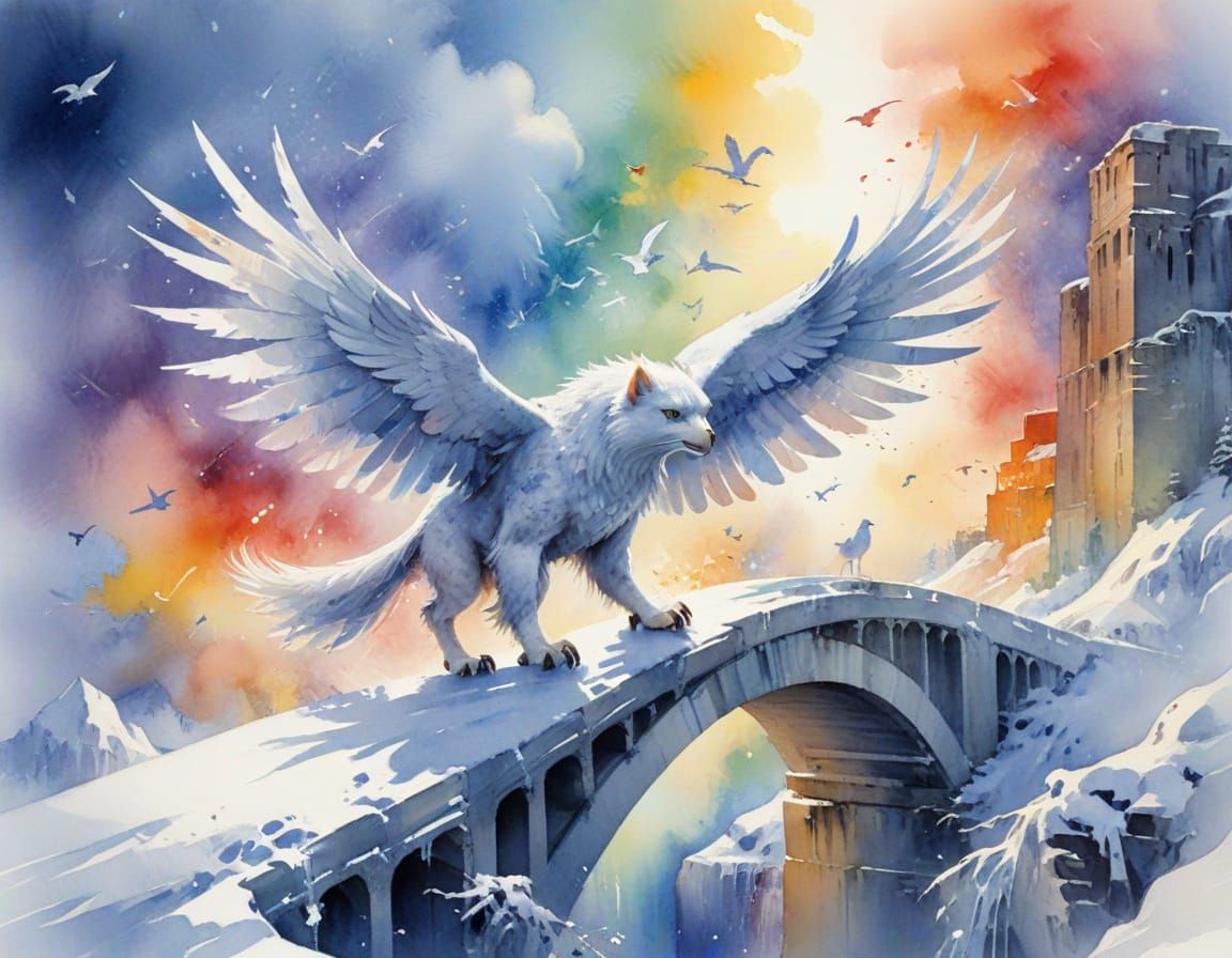 This image shows a watercolor painting of a winter griffin perched on a summer rainbow bridge. It's a stylized watercolor artwork with expressive techniques and cinematic stylization.