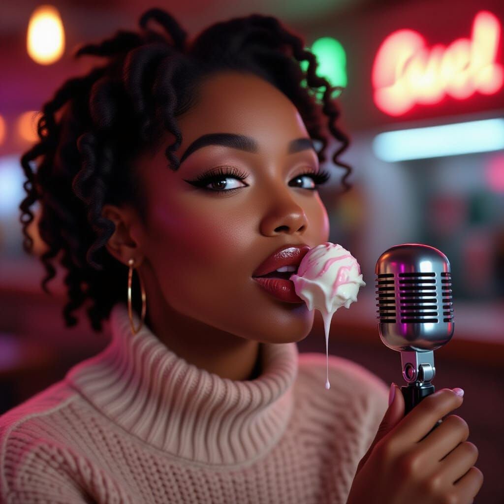 This image captures a close-up of a woman with deep skin enjoying ice cream near a binaural microphone, illuminated by neon cafe lights. The scene evokes a playful ASMR aesthetic with cinematic lighting and shallow depth of field.