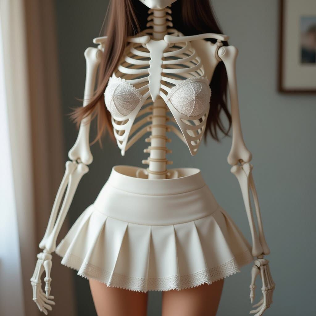 This image depicts a hyperrealistic panoramic view of a female skeleton. The skeleton is styled as a beautiful young woman wearing a very short miniskirt.