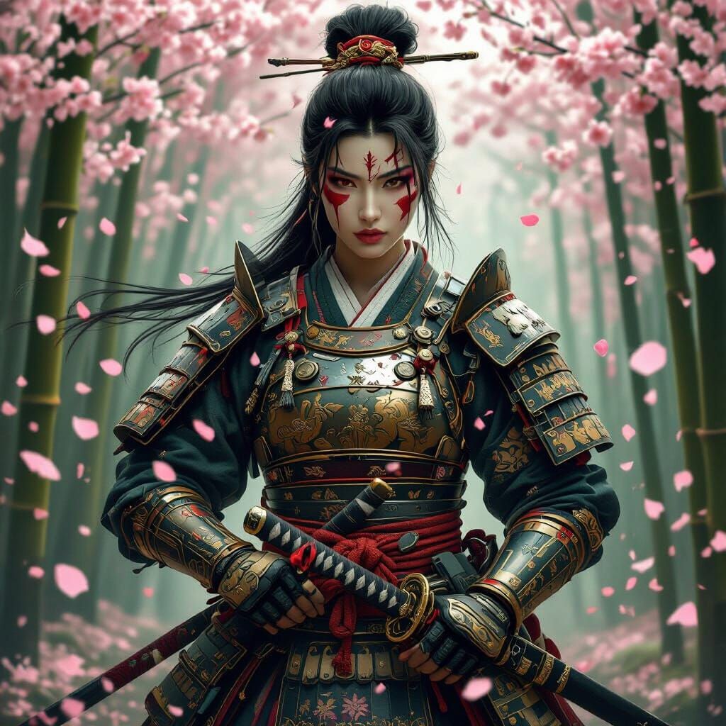 A hyperrealistic image of a samurai warrior queen in a bamboo forest. The art nouveau-inspired portrait features cherry blossoms and ornate armor, rendered with cinematic lighting and a fantasy art aesthetic.