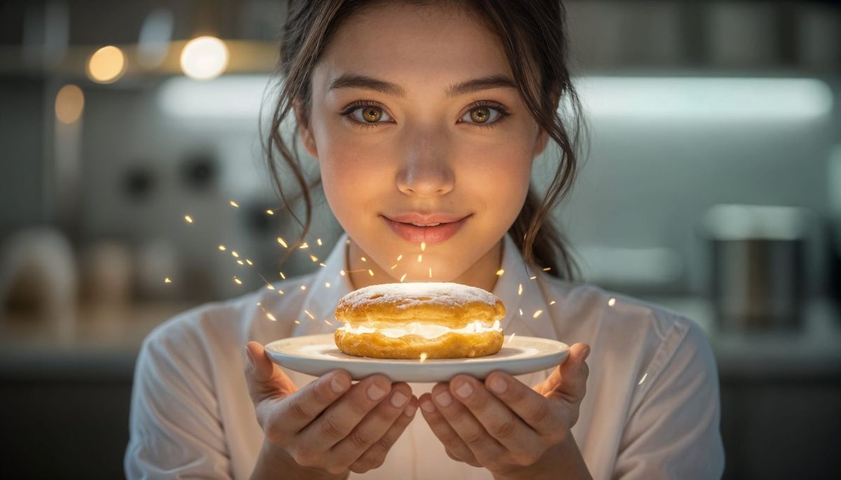A close-up portrait focusing on hands holding a floating pastry that emits soft, internal light. Subtle sparks emphasize the magical focal point in this detailed, clean composition.