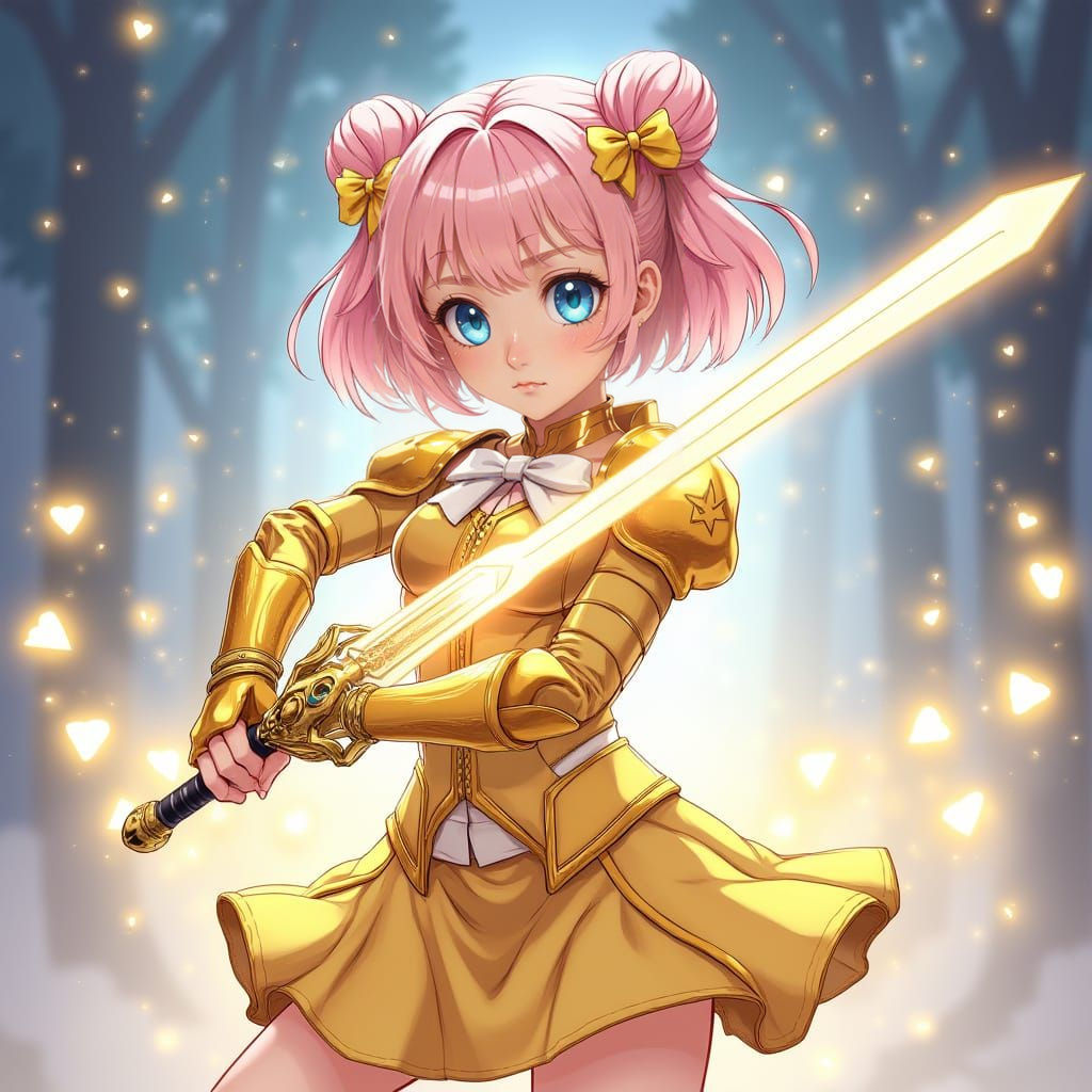 "A cute high school girl with light pink, heart shaped buns, short hair and light blue eyes transforming into a beautiful sci-fi style magical golden yellow armor with a golden yellow skirt and a golden, with a white bow in the front and back and white short magical sci-fi glowing sword. Masterpiece, Best Quality, flat, Manga Scan, Anime, cinematic lighting, drawn Art, by Studio Trigger, clip studio paint, Anime Wallpaper, Deep Color, Cel-Shaded"