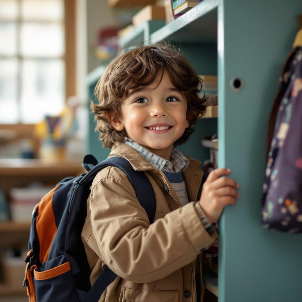 This image depicts a smiling boy with a jacket and backpack searching through a school locker in a vibrant educational setting. The style is reminiscent of Yoshitaka Amano with detailed and colorful elements, and soft textures.