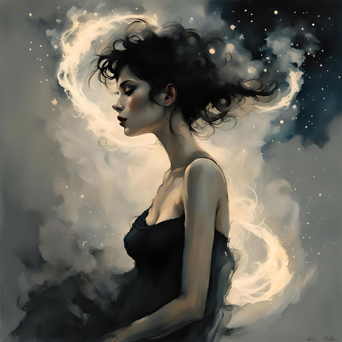 A captivating image of a woman composed of smoke set against a starlit night. The artwork evokes a painterly aesthetic with flowing lines and luminous highlights.
