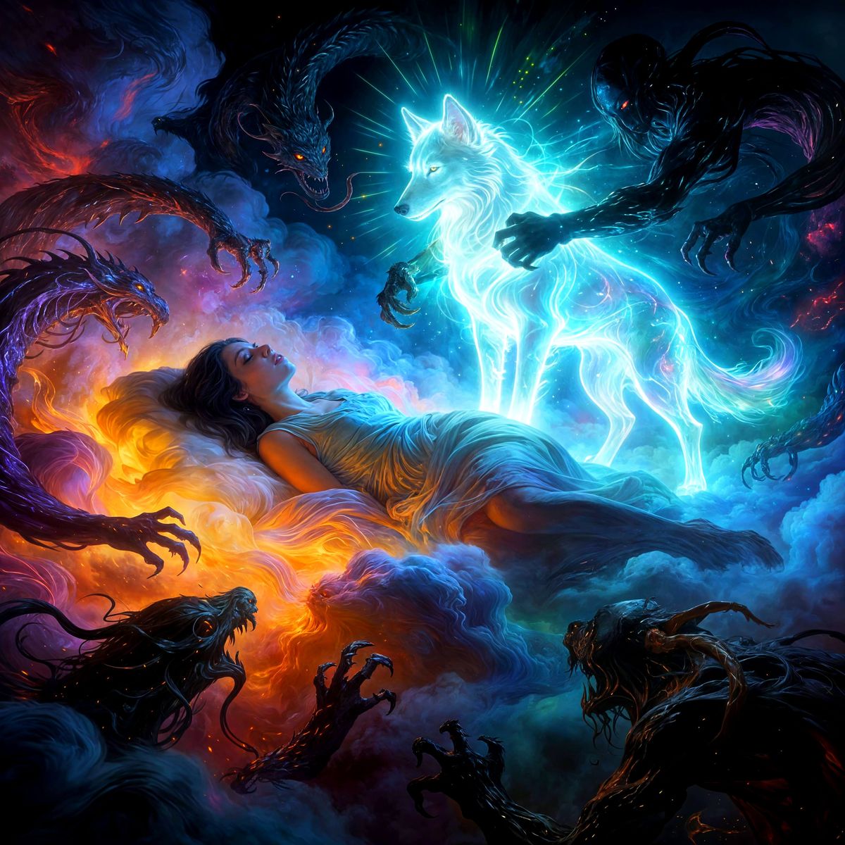A woman peacefully sleeps surrounded by swirling nightmares, protected by a luminous spectral dog. Rendered in a fantastical art style with vivid colors and dynamic lighting.