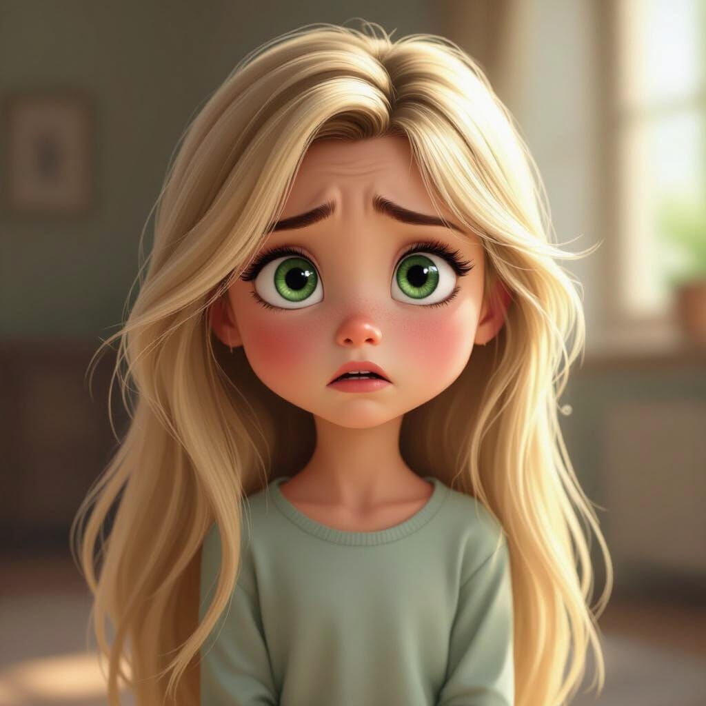 This image shows a blond-haired girl with green eyes and an upset expression. The image is reminiscent of Pixar animation, with a cartoon semi-realistic aesthetic and cinematic lighting.