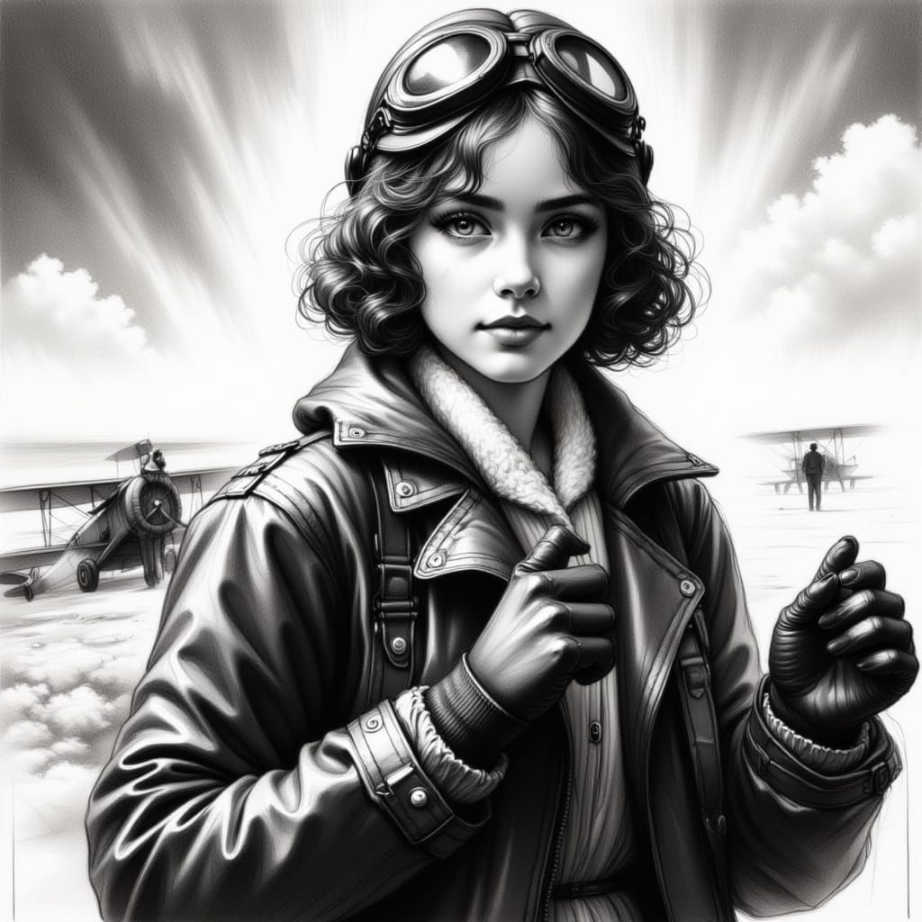 Generate your own vintage black and white illustrations of confident female aviators, inspired by early 20th-century pulp art. Free and easy!