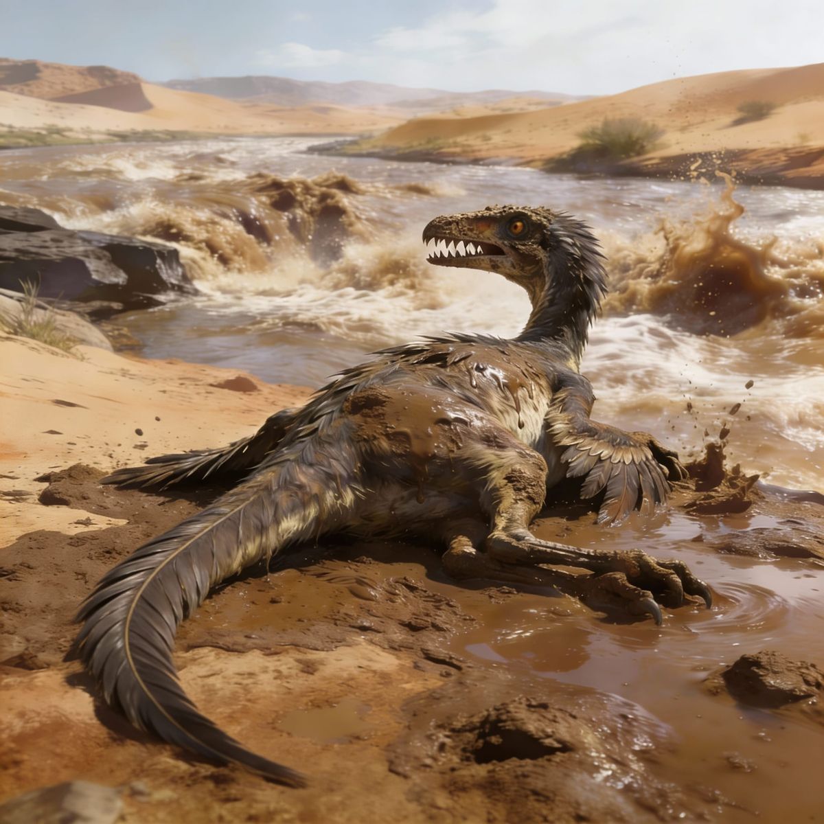 This paleoart painting shows a soaked Coelophysis on a muddy riverbank after a flash flood. The image captures the dinosaur's exhaustion and alarm, with detailed textures of feathers, water, and mud.