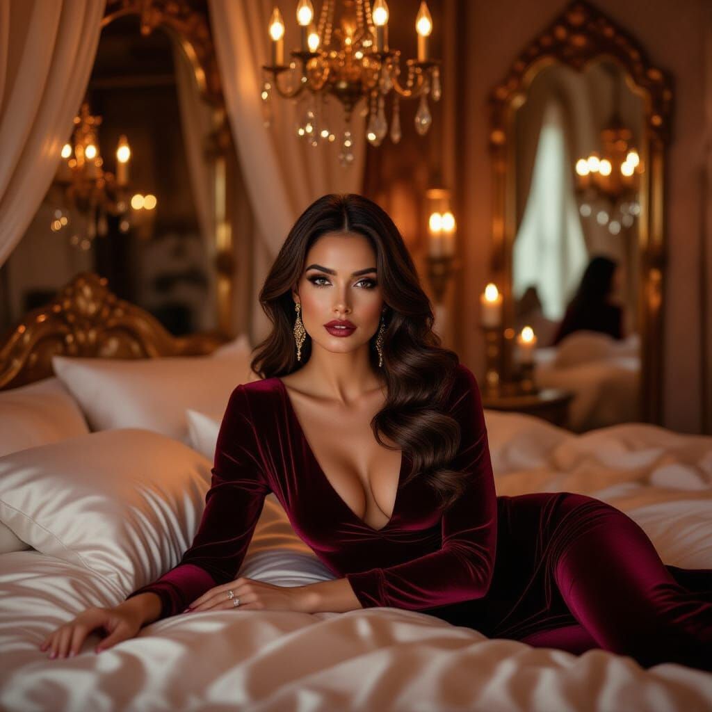 This image shows a brunette woman in a burgundy velvet outfit, posed on silky sheets in a candlelit boudoir. The scene evokes a luxurious, seductive atmosphere with warm cinematic tones.