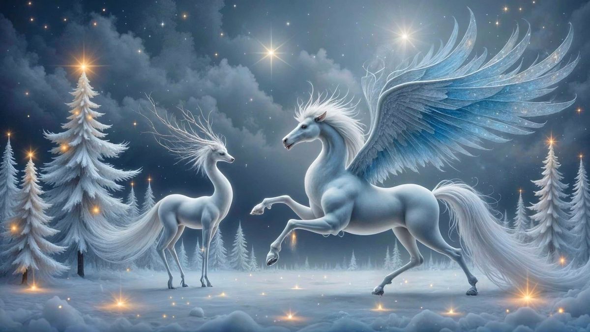 This image depicts a thankful winter scene with metallic, ethereal swirls of silver and blue, evoking a dreamy and enchanted atmosphere.