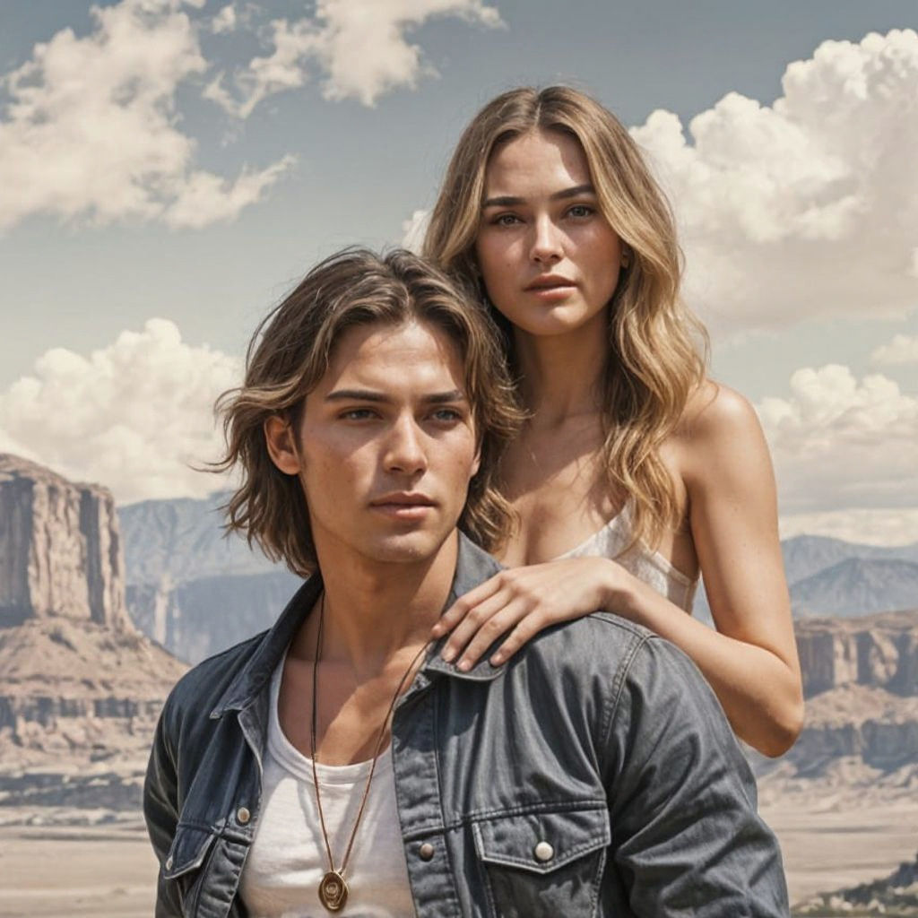 This image shows a retro Polaroid-style photo of a young couple embracing in a desert landscape. The man has chiseled features, while the woman wears a halter top, set against red rocks and a watercolor-style sky.