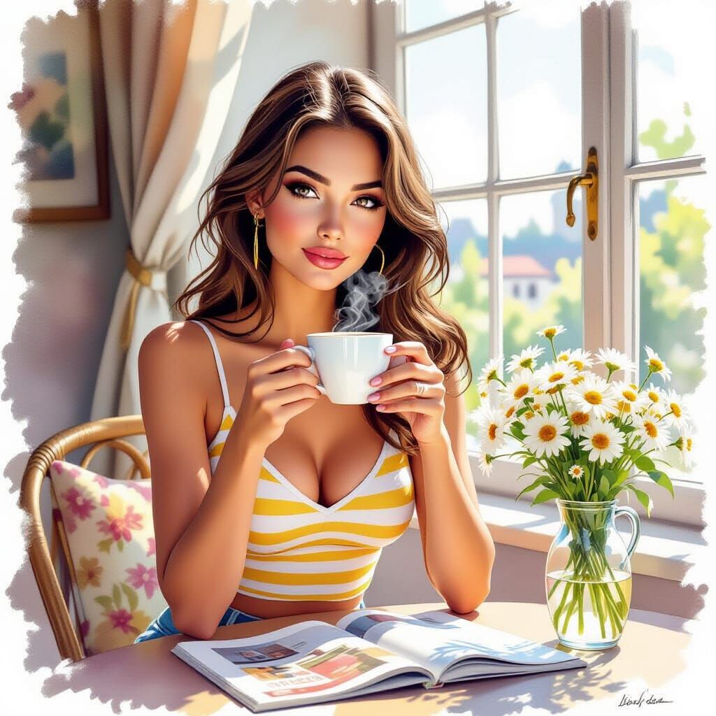 This image shows a beautiful Russian woman enjoying coffee on a summer day. Rendered in soft watercolors, the artwork captures a blend of sensuality and delicacy with natural color mixing.