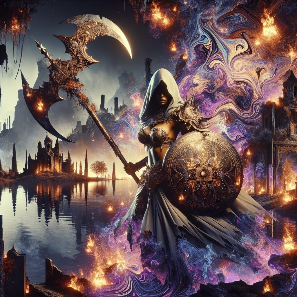 A powerful South Asian warrior wields a large axe and shield on a ruined floating island above a soul-filled lake, depicted with ethereal double-exposure flames and oriental patterns in an alcohol ink style. Dark fantasy elements and vibrant purple and yellow lighting dominate.