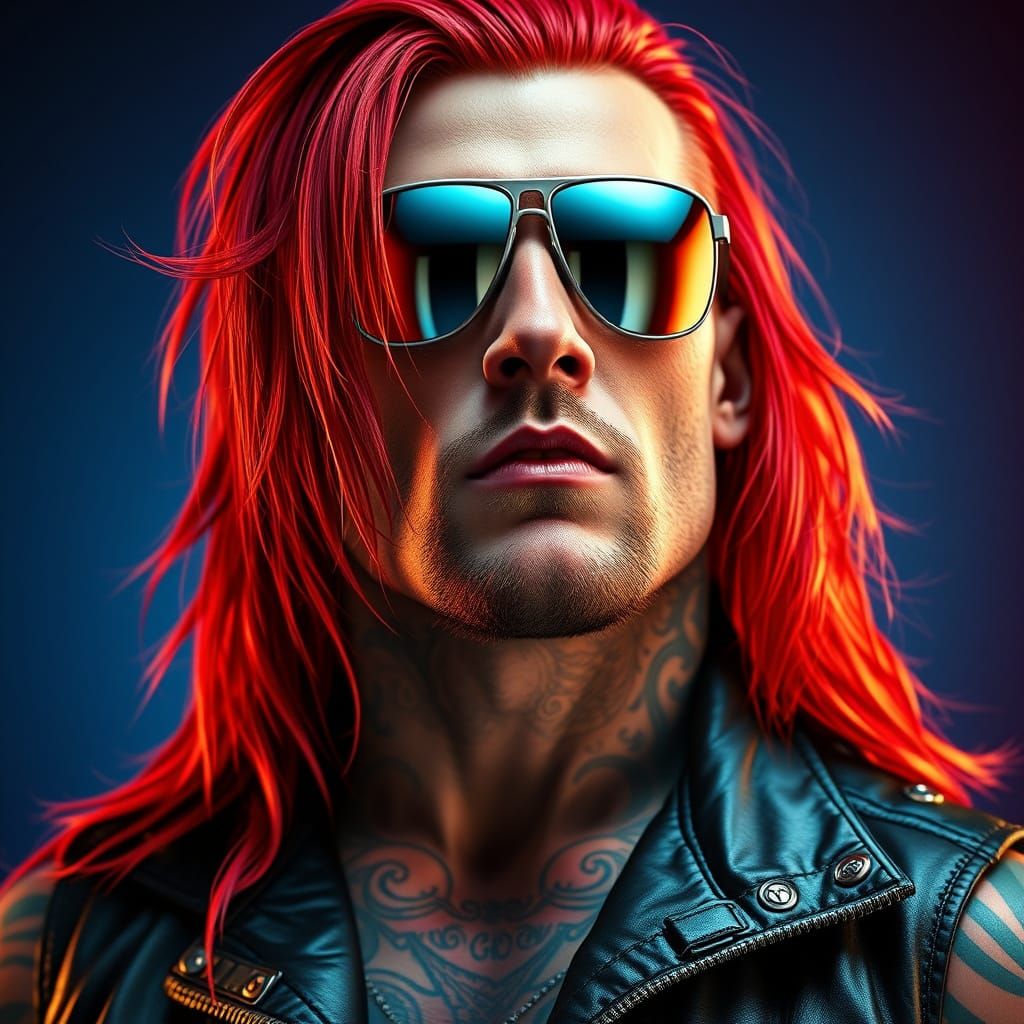 This image is a striking portrait of a male wrestler with vibrant tattoos, long red hair, and mirrored silver sunglasses, set against a rich, colorful background that gradates into deep blue. The intricate details of the subject's facial structure, hair, and tattoos are meticulously rendered, with an emp...