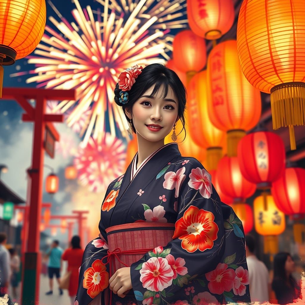 This image shows a Japanese woman in a yukata at a summer festival. Fireworks light up the background, rendered with bold brushstrokes and vibrant colors in a contemporary art style.