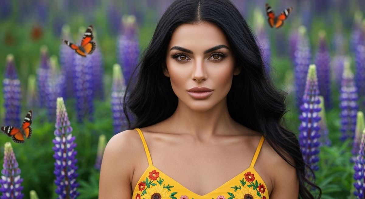 A vivid image of a woman with long hair in a butterfly-embroidered lace dress, standing in a field of lupinus flowers. The image is dynamic, rich in color, and rendered in a surreal style.