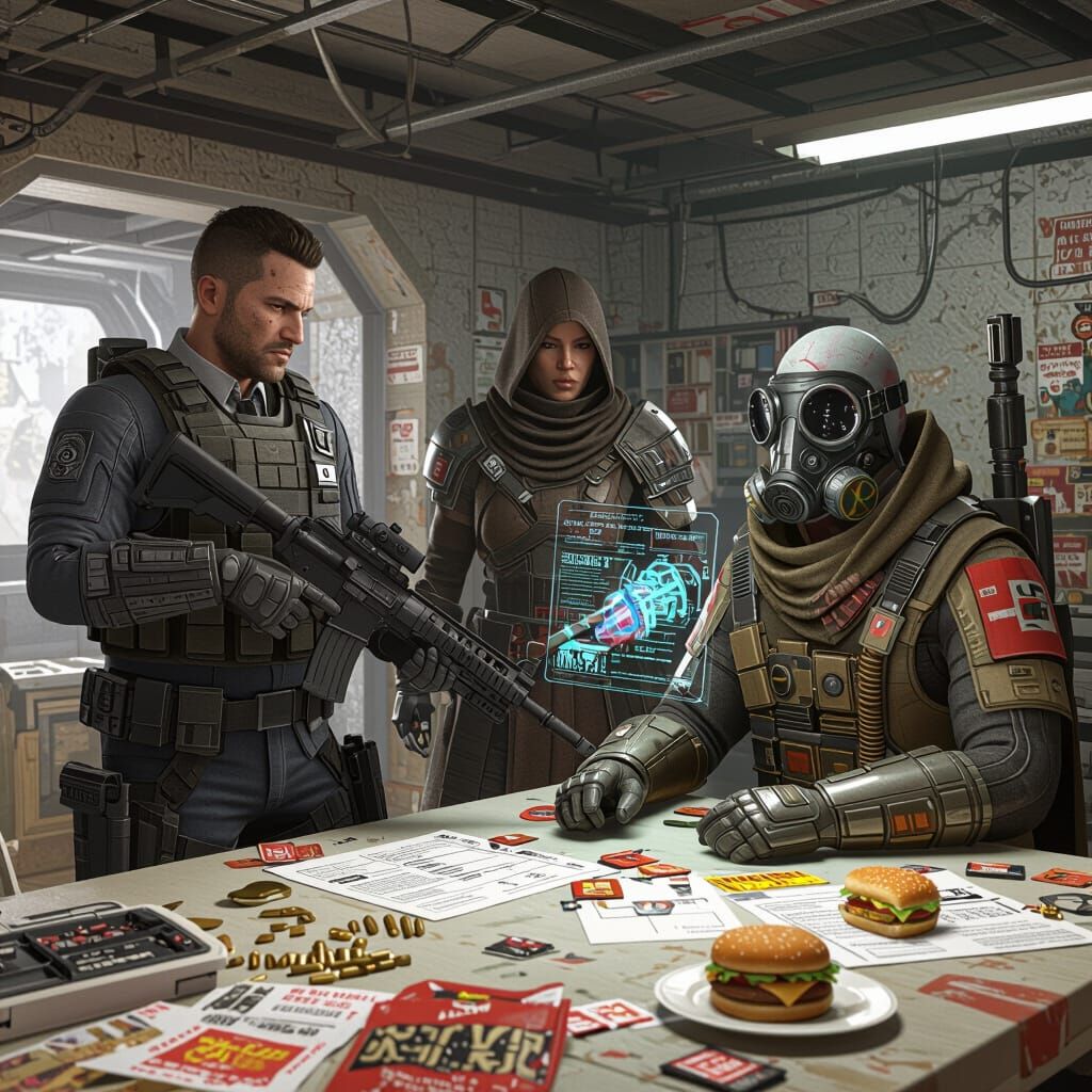 This image captures a photorealistic lineup of diverse characters in a cluttered safehouse, illuminated by contrasting warm and cool lights for a dramatic effect.