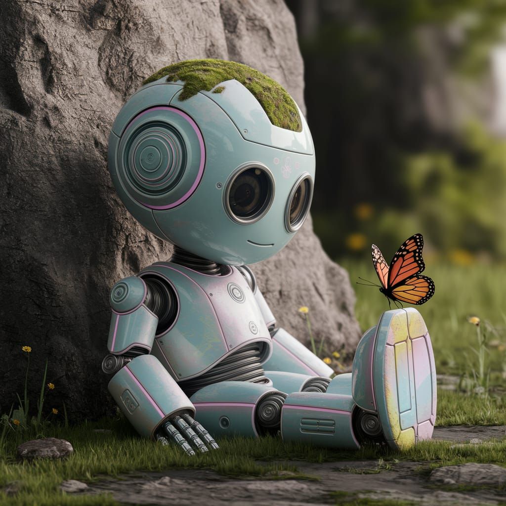 A fantastical scene of a moss-covered robot, rediscovered by a beautiful butterfly, set against a backdrop of vibrant pastel hues and intricate detail, reminiscent of fantasy concept art.