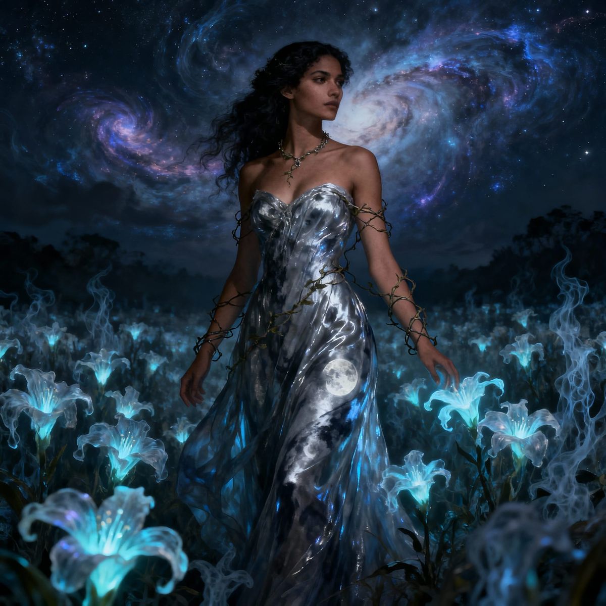 A regal spectral queen stands in a field of glowing flowers under a nebulae-filled sky. This dark fantasy concept art blends Pre-Raphaelite romanticism with dramatic, moody lighting.