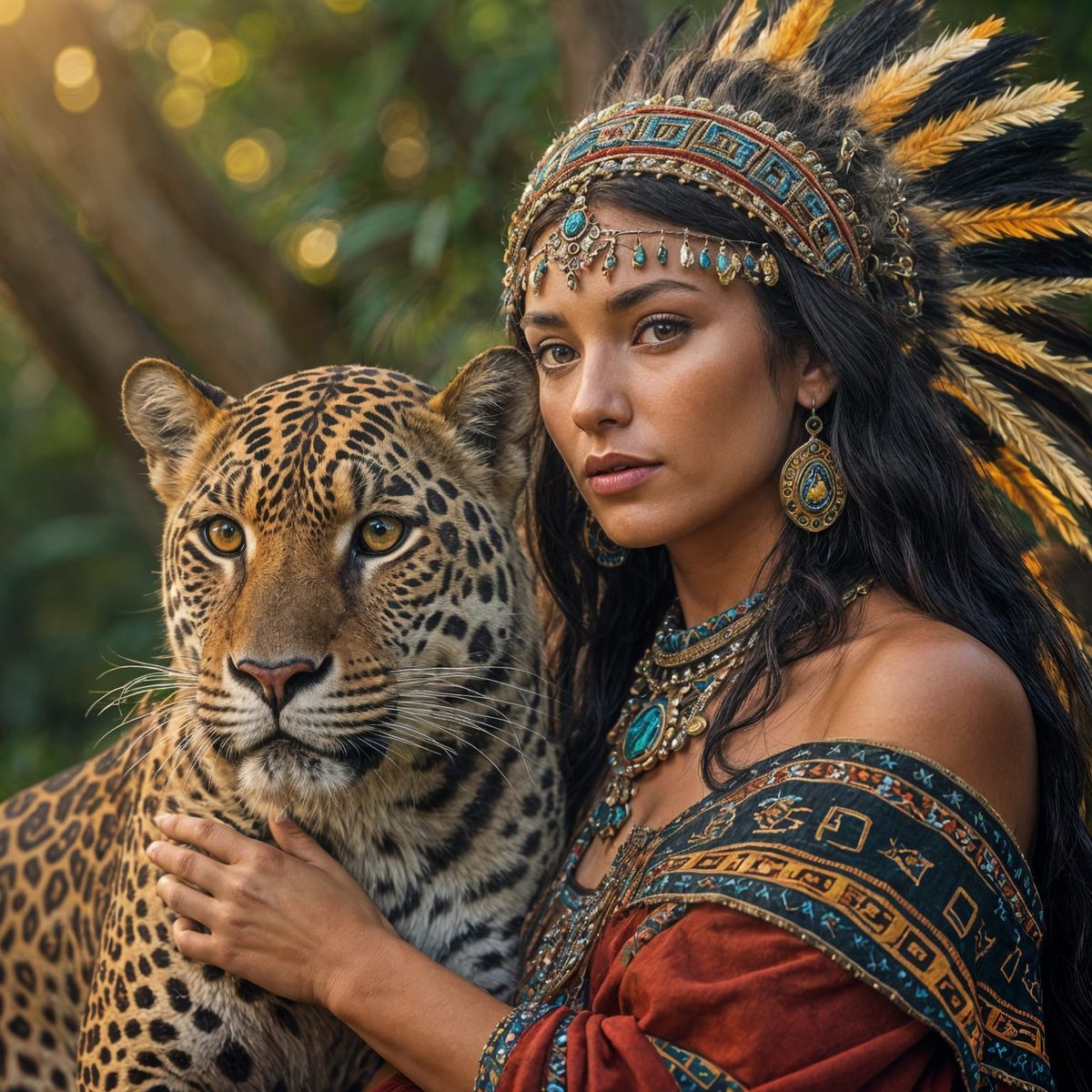 Easily generate your own high-quality images of Aztec princesses and their majestic pets with our free AI portrait generator