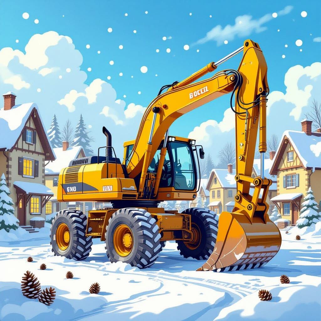 This image shows a big yellow excavator truck parked in a snowy village square. The scene is rendered in a vibrant watercolor style with bright, glossy colors, creating a whimsical and charming effect.