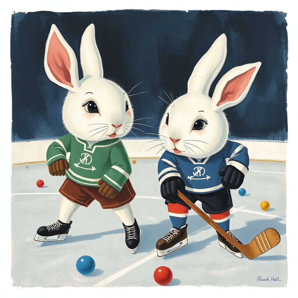 Easily generate your own unique sports posters featuring rabbits hockey, inspired by famous artists. Try it free!