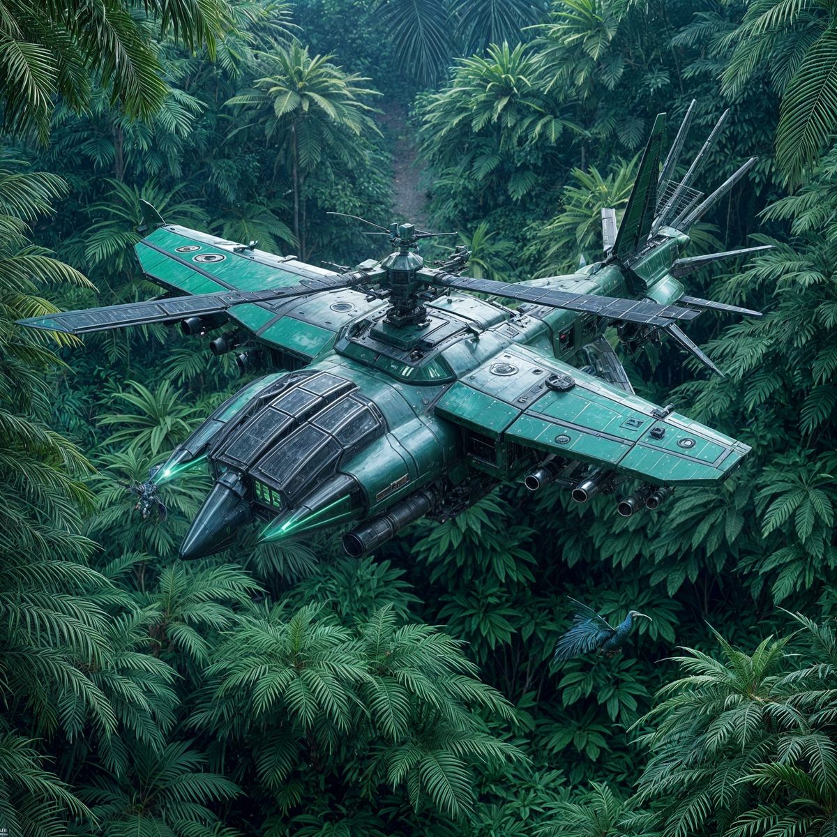 in the dense, subtropical broadleaf forest, surrounded by lush greenery. The mechanical green peafowl transforms into a powerful combat helicopter. Its body shifts into a heavily armored frame, painted in shimmering emerald green and blue. The wings retract and reform into a dual-rotor system, with blades ...