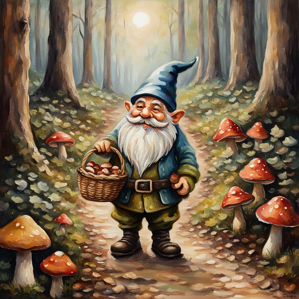 This image shows a gnome standing on a path with a mushroom basket. The artwork features impressionist brushstrokes, soft focus, and a warm, earthy color palette, creating a whimsical effect.