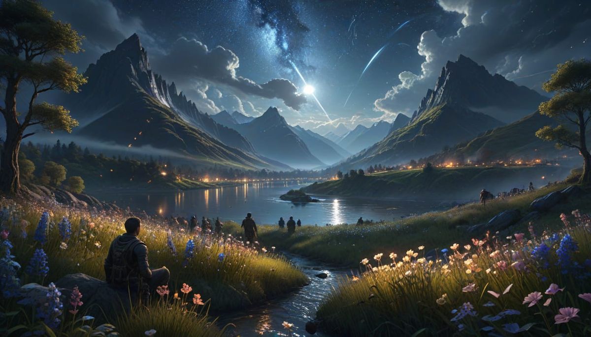 This concept art features a group gazing at a starry night sky, surrounded by a serene landscape of flowers, rivers, and mountains. Divine light beams create an awe-inspiring, heavenly atmosphere with intricate detail.