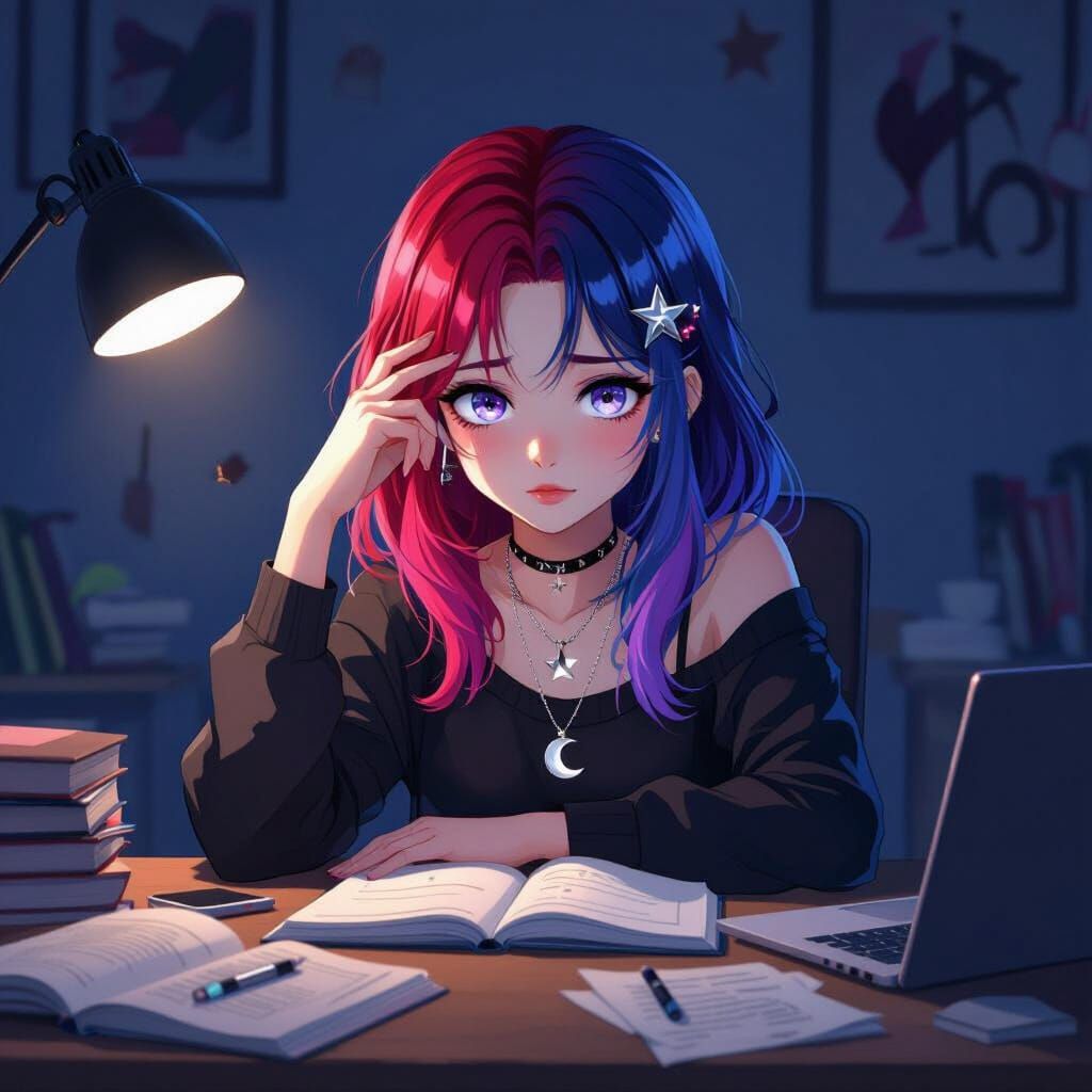 This image shows a teenage girl with colorful hair at her desk in a dimly lit bedroom. Surrounded by books and a laptop, she looks tired and stressed in this cel-shaded anime illustration.