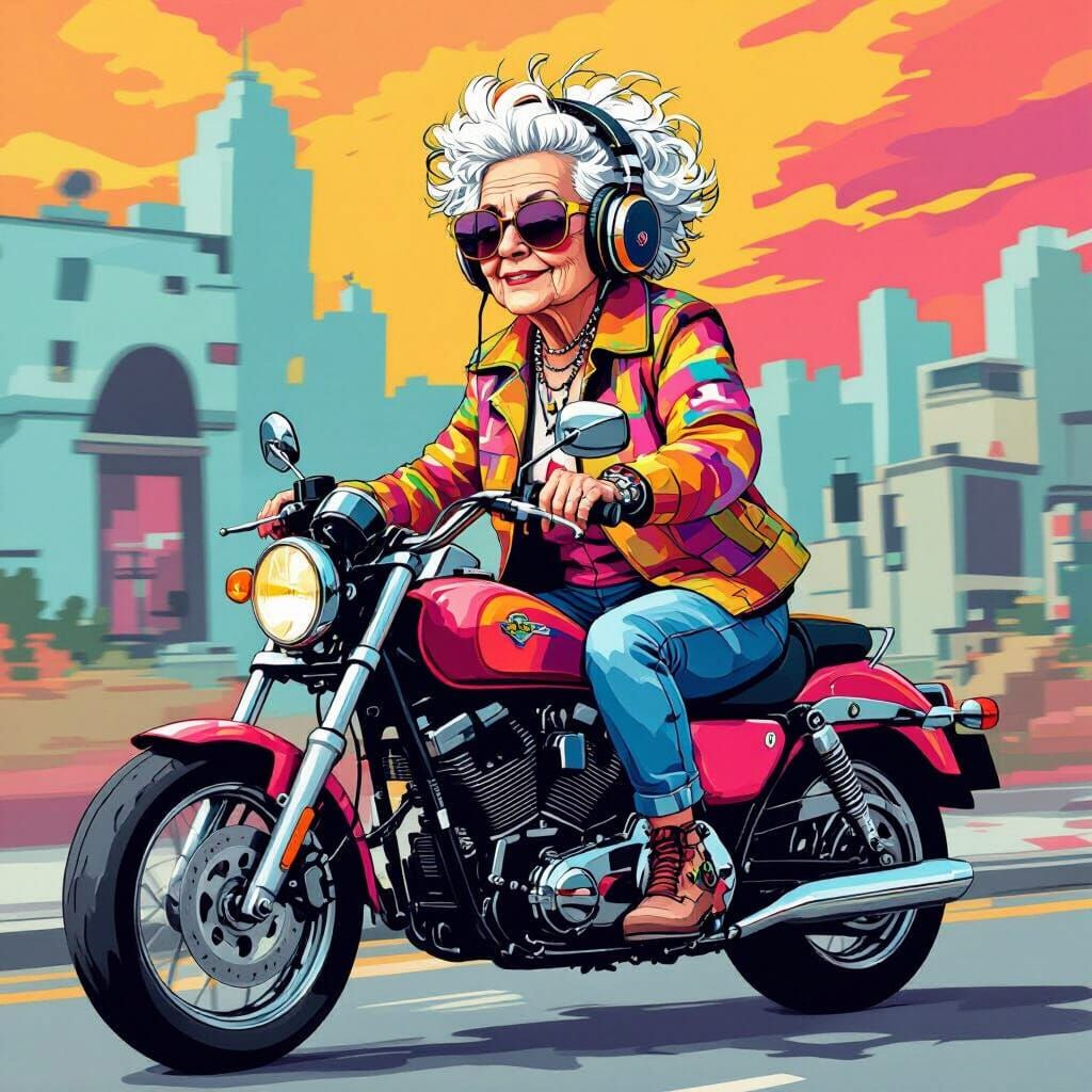 A vibrant image of a cool 70-year-old grandmother riding a motorcycle. She's wearing colorful streetwear and headphones, depicted with bold lines, flat shadows and exaggerated expressions in a pixel art style.
