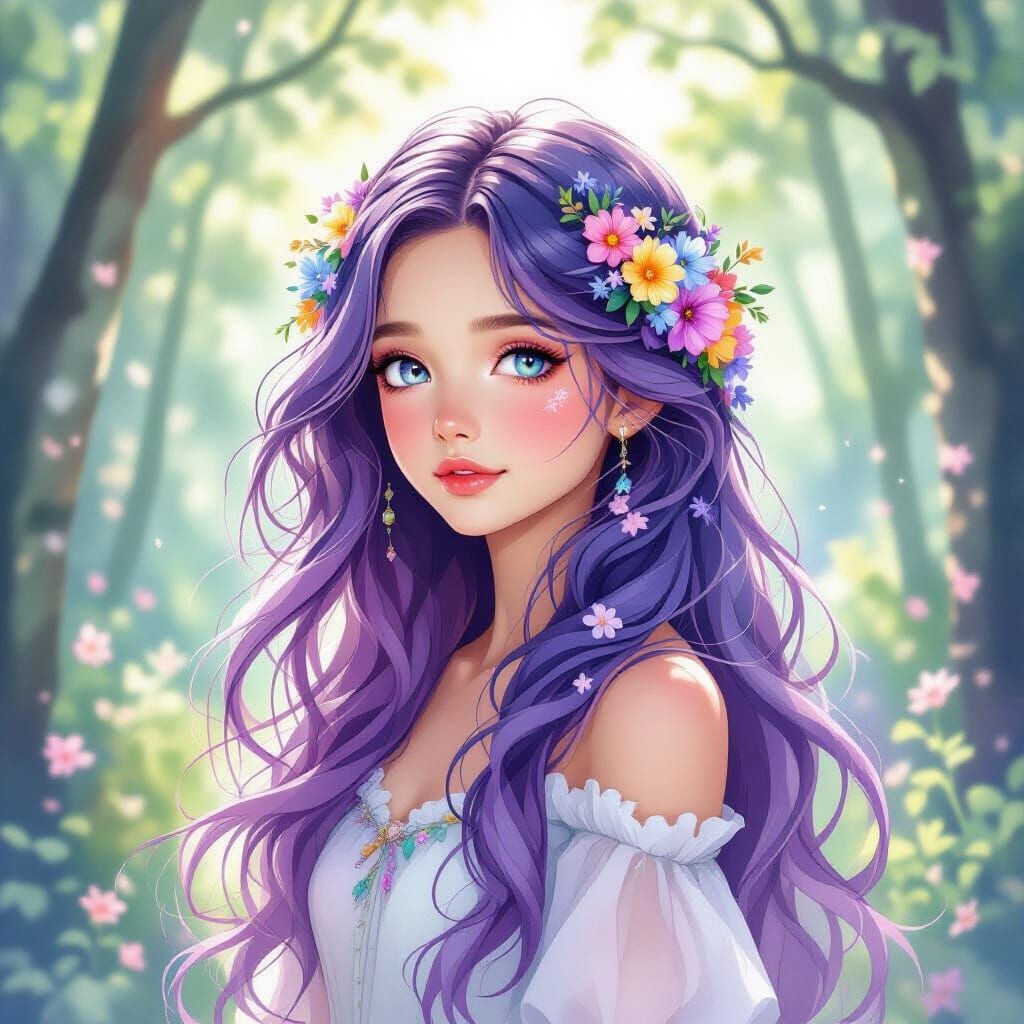 A watercolor painting of a girl with purple hair and rainbow flowers in a sunlit forest. The soft pastel colors and painterly style evoke a whimsical, mystical aesthetic.
