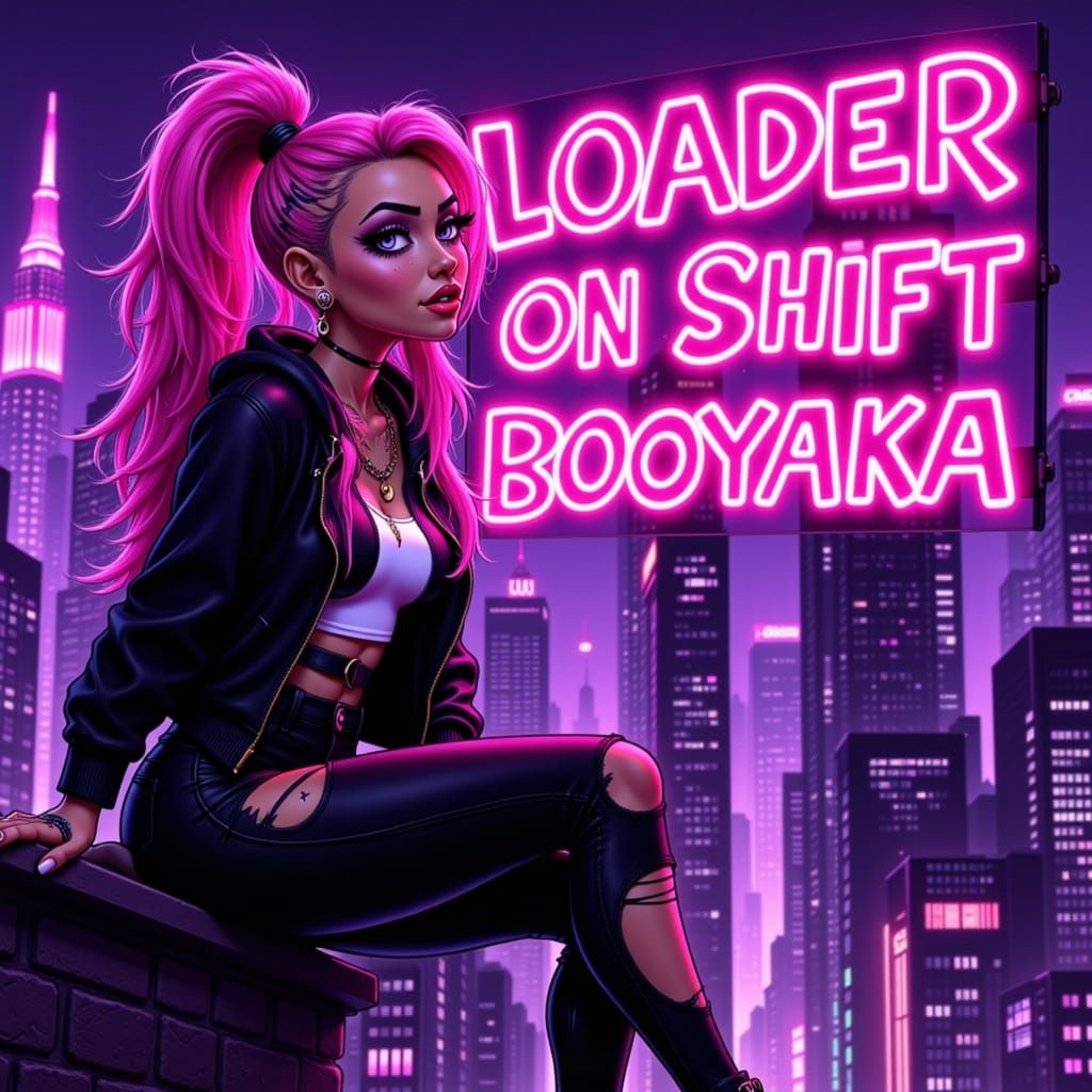 This digital art features a woman with pink and purple dreadlocks on a building ledge, overlooking a vibrant neon city at night. Inspired by anime aesthetics, it uses vivid neon lighting for a cinematic feel.