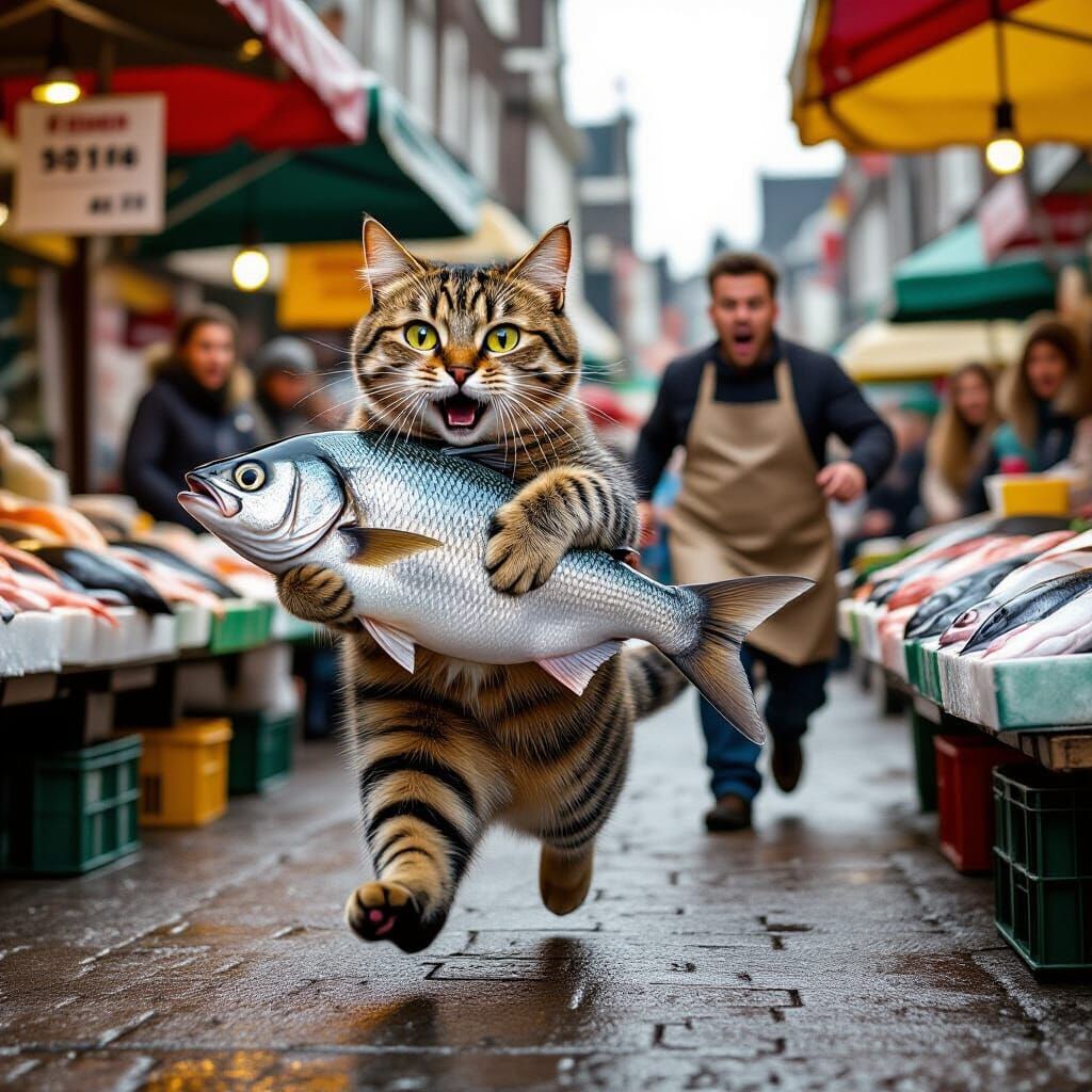 A photorealistic, ultra-detailed scene on a bustling Dutch street market. An anthropomorphized tabby cat runs on two legs, clutching a silver fish, pursued by a shocked vendor. Freeze-frame action shot.
