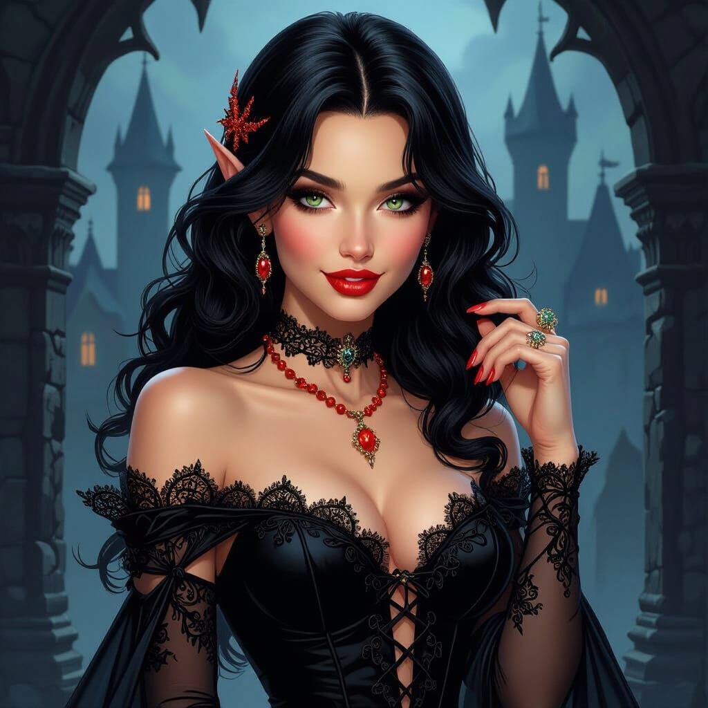 A striking picture of a beautiful elf with black hair in a black castle. She is wearing a black dress, holding a red necklace, and smirking. The image has dramatic lighting and atmospheric shading, reminiscent of fantasy art.
