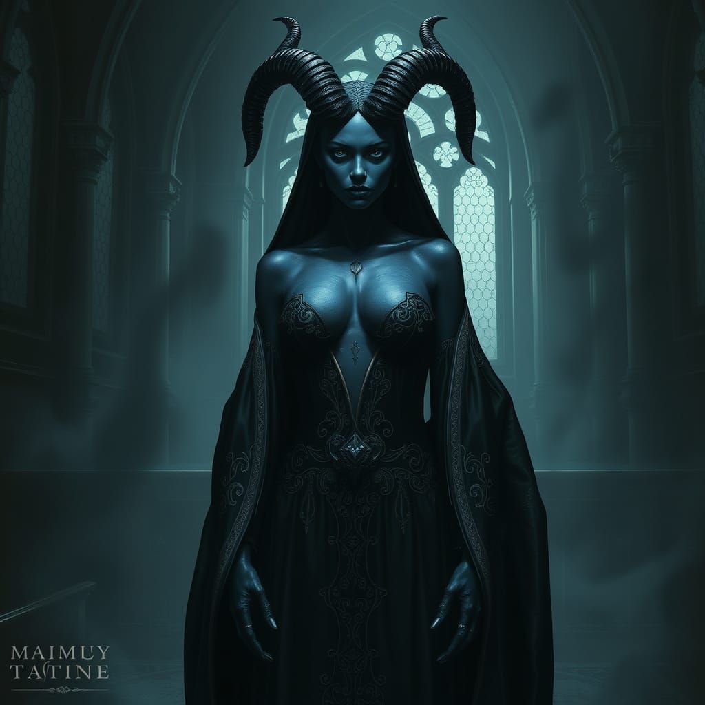 A striking picture of a bare-chested, blue-skinned priestess with curved horns in a shadowy chapel. She wears a ceremonial robe with silver embroidery in a dark, gothic aesthetic.