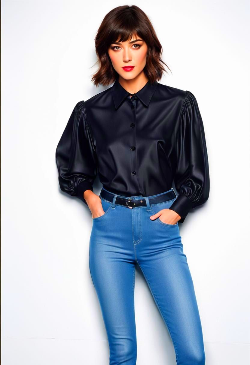 This image shows a glamorous woman standing in an opulent Art Deco setting, dressed in a white satin shirt and light blue jeans, with high heel black boots and short black hair.