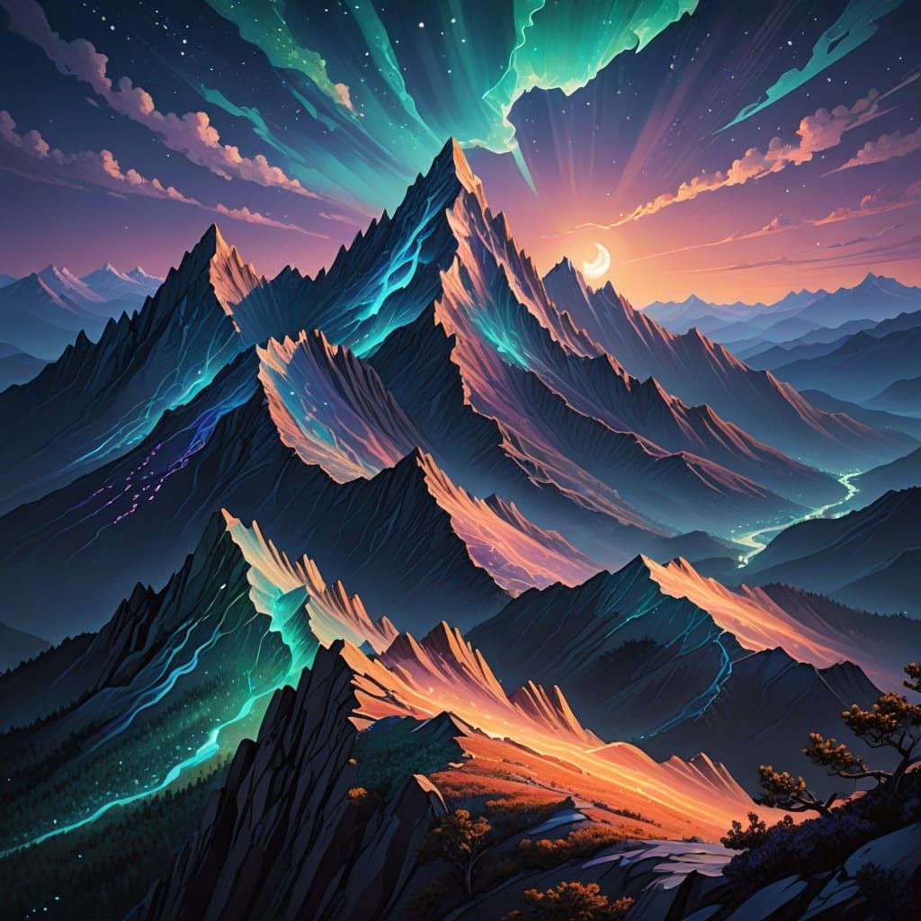 A breathtaking fantasy landscape featuring a jagged mountain ridge under a moonlit sky. The digital painting showcases iridescent opals, twinkling stars, and soft, radiant light. The artwork is rendered in vibrant colors.