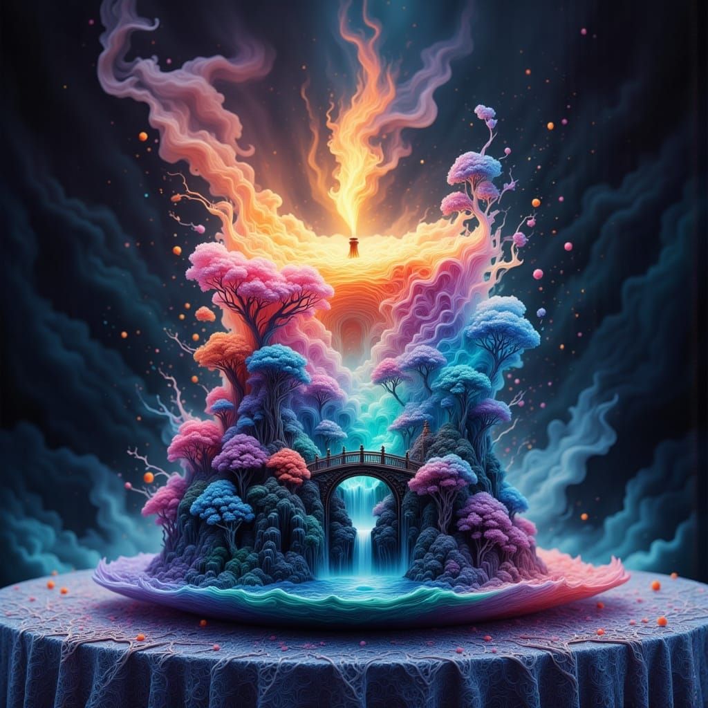 This surreal image shows a glowing fractal candle revealing a mystical world within, with a pastel neon-lit lake, fractal birds emerging from embers, and a tiny stone bridge over a waterfall, set on a delicate lace tablecloth.