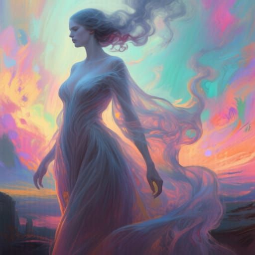 This image shows a female figure formed from smoke, adorned in a flowing gown, against a colorful background. The artwork features dynamic lighting and a rich color palette in a digital painting style.