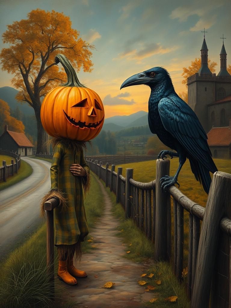 This image shows a scarecrow with a gourd head chatting to a crow in glasses on a country road. The landscape is surreal and painted with oil on canvas, in a whimsical medieval style.