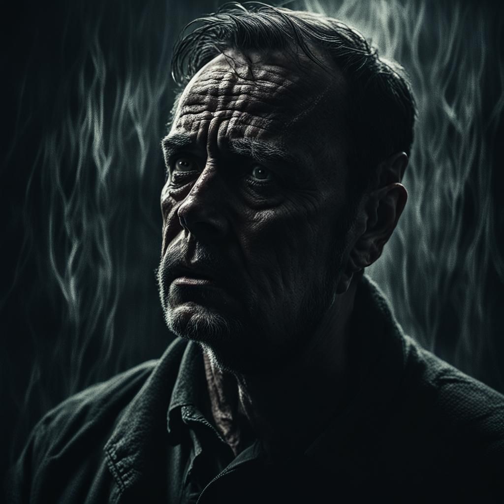 A close-up portrait of a man with a scared expression in a dimly lit room. The image uses desaturated colors, rough brush strokes, and dark shadows to create a creepy atmosphere in an expressionist style.