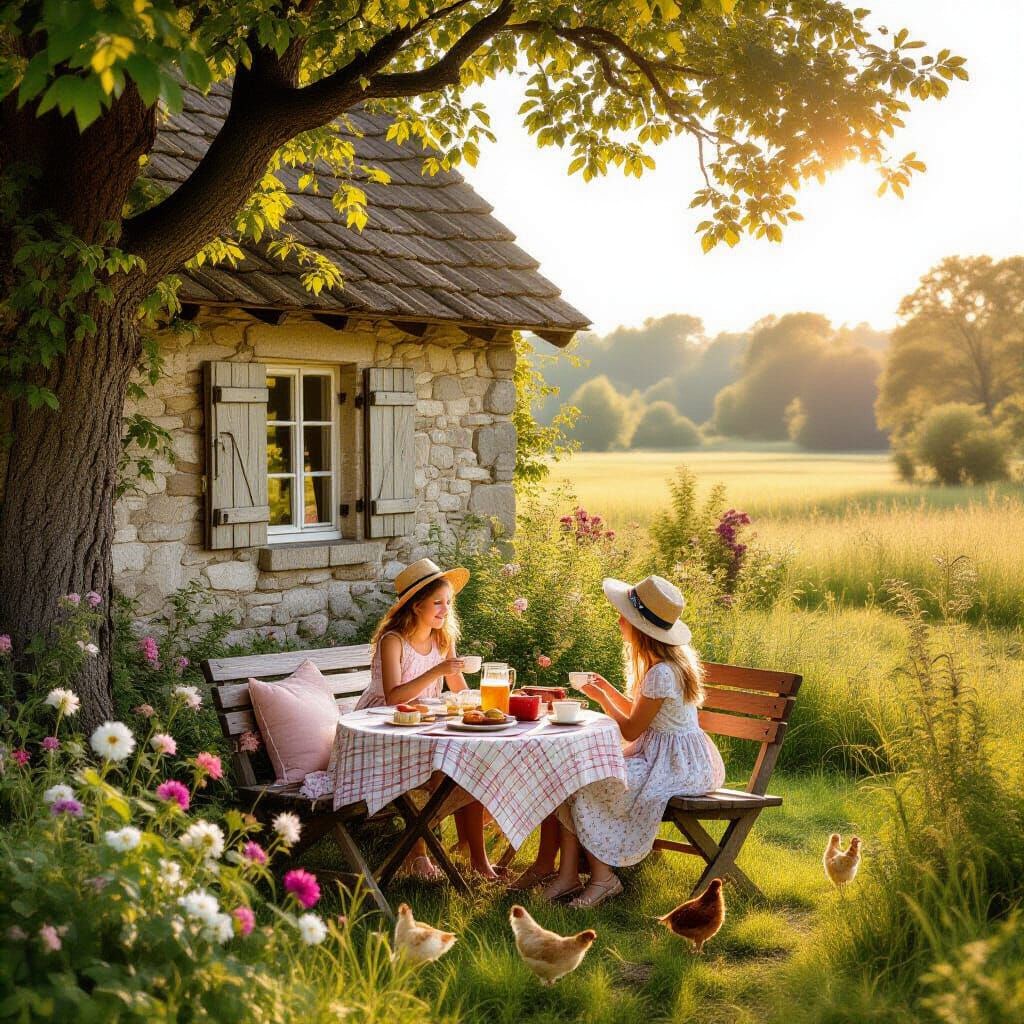 This image depicts a charming cottagecore scene with a stone cottage covered in climbing roses, surrounded by wildflowers and tall grass. A girl serves tea near an oak tree, with chickens nearby.