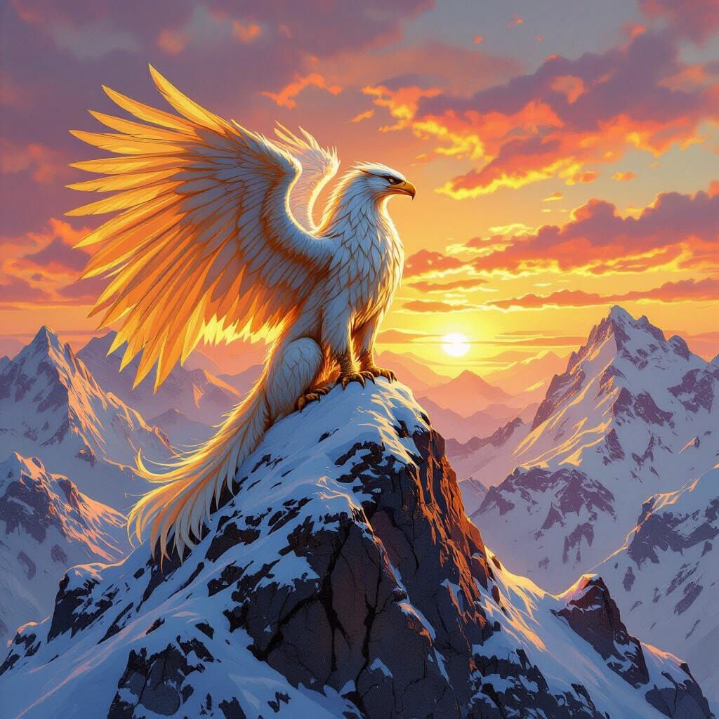 A striking picture of a griffin at dusk on a snowy mountain top. The creature's plumage glows with gold and red in this richly detailed fantasy scene with dramatic lighting.