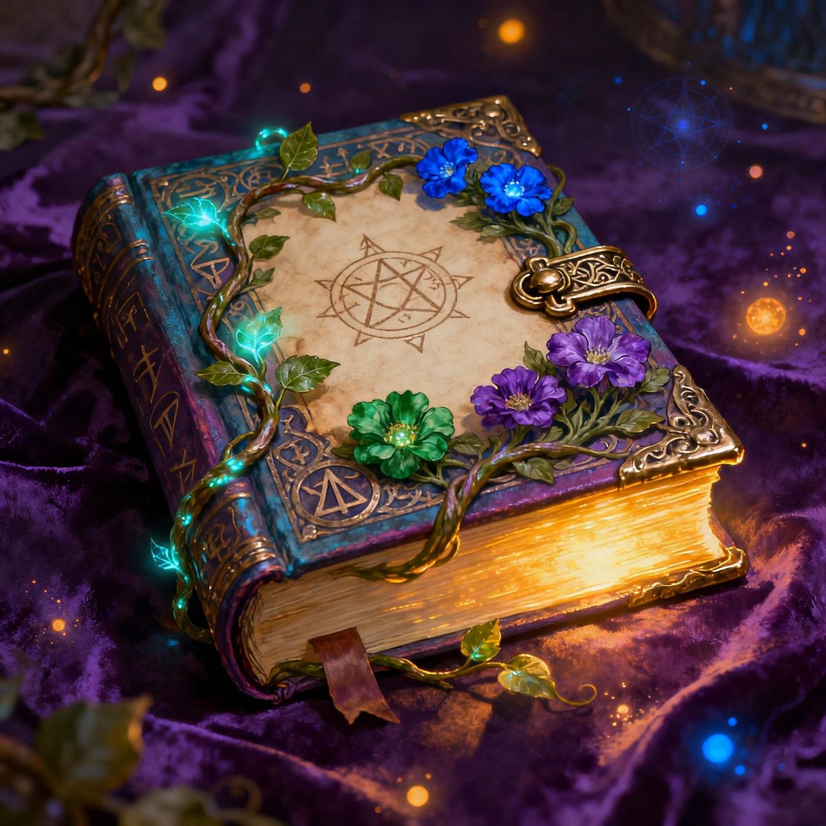 Easily design unique, jewel-toned fantasy spellbooks with glowing pages and whimsical flora. Try our free AI image generator now!