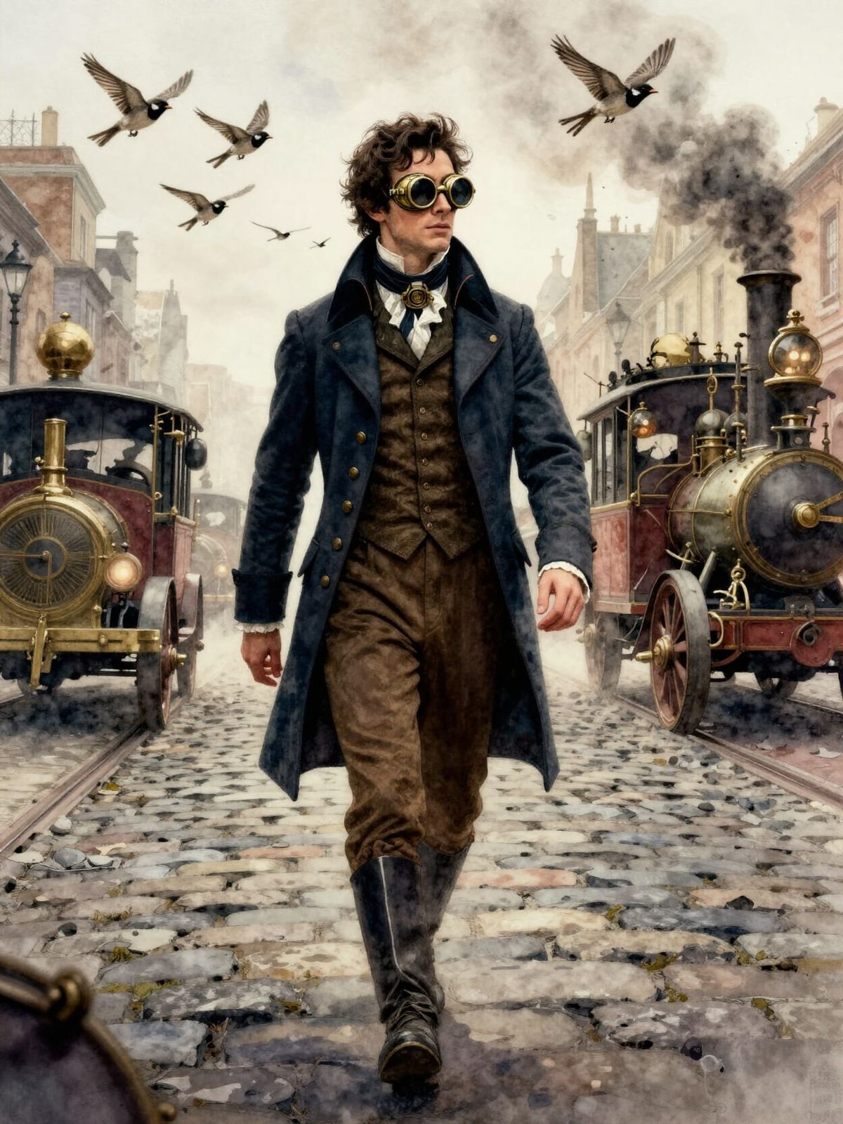 A striking painting of a young prince in steampunk attire walking down a cobblestone street with sparrows and steam cars. Features watercolor sfumato and sharp outlines, with dramatic lighting.
