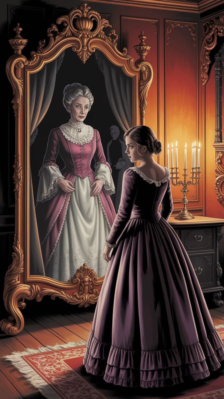 A young woman's reflection in a mirror reveals a sinister presence, an elderly woman in Victorian attire, materializing behind her in a dimly lit bedroom with intricate wood carvings and flickering candlelight.
